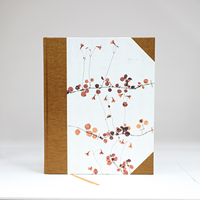 En vävd, handtillverkad anteckningsbok från det lettiska tryckeriet Purpurs. Motivet är Lena Granfelts foto av Carl von Linnés herbariska efterlämningar.